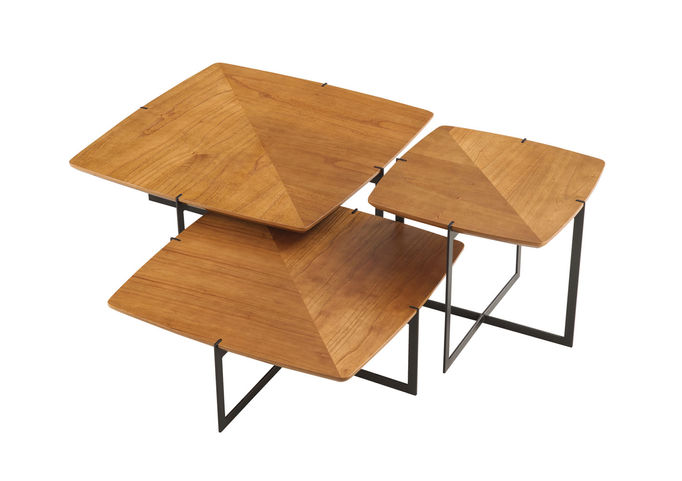 The geometric composition and the cuts in the tops are the distinguishing characteristics of the tables. The bold and dynamic lines, similar to a kite, form the top. They can be composed of different shapes and quantities in the environment. Metal base. Top covered in natural wooden blade, marked by the opposite direction of the blade veins.